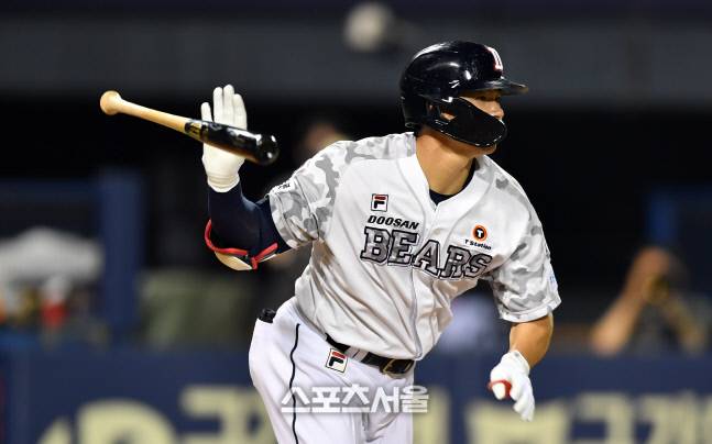두산 4번타자 김재환이 24일 잠실구장에서 열린 2022프로야구 두산베어스와 KIA타이거즈의 경기 6회말 선두타자안타로 출루하고 있다.2022.6.23.