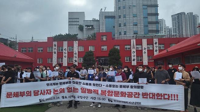 (서울=연합뉴스) 임지우 기자 = 24일 한국연극협회 비상대책위원회가 문화체육관광부의 서교동 복합문화공간 조성 사업에 반대하는 항의 방문을 했다. 2022.06.24
