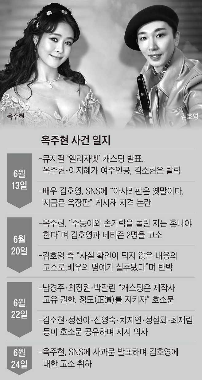EMK뮤지컬컴퍼니가 지난 13일 뮤지컬 ‘엘리자벳’ 캐스팅을 발표한 직후 소셜미디어(SNS)에 올라온 이 짧은 품평은 일파만파였다. 게시자는 뮤지컬 배우 김호영. 여배우 중 티켓파워 원톱으로 꼽히는 옥주현은 지난 20일 “주둥이와 손가락을 놀린 자는 혼나야 한다”며 김호영과 네티즌 2명을 고소했다. ‘엘리자벳’ 여주인공으로 옥주현·이지혜가 뽑히고 베테랑 김소현이 탈락한 가운데, 옥주현은 ‘옥장판’이 자신을 지칭한다고 믿었기 때문이다. 뮤지컬 전업 배우 1세대인 남경주·최정원과 박칼린 음악감독이 22일 “배우가 캐스팅을 침범하면 안 된다”고 호소할 정도로 ‘인맥(친분) 캐스팅’ 논란은 파장이 점점 더 커졌다.