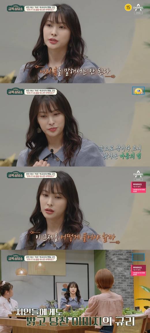 이날 박규리는 "방송에서 보이는 자존감 넘치는 모습 때문에 오히려 인간적인 고민은 실제로 말하질 못한다. 연예인이기도 하고, 카라의 멤버이기도 하고, 여러 포지션 때문에 내 흠을 말해선 안된다는 생각을 가지고 있다"며 말문을 열었다.
