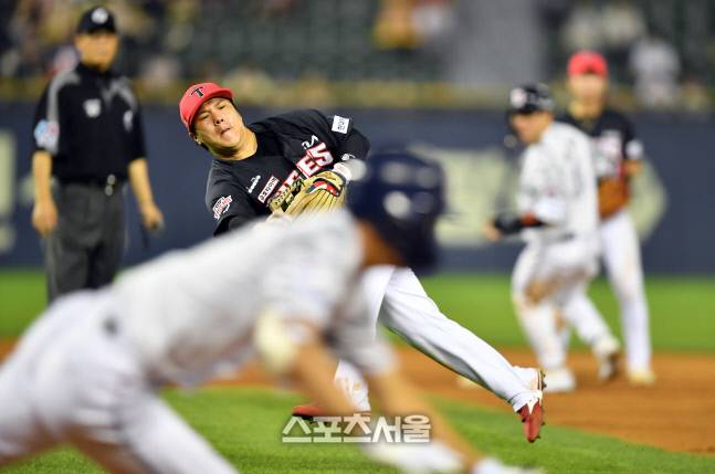 KIA 2루수 김선빈이 24일 잠실구장에서 열린 2022프로야구 두산베어스와 KIA타이거즈의 경기 8회말 2사 1루 두산 8번 안재석의 타구를 잡아 1루로 송구하고 있다. 안재석이 헤드퍼스트슬라이딩으로 세이프됐다.2022.6.23.