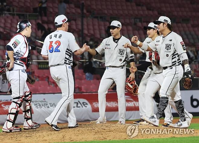 (수원=연합뉴스) 홍기원 기자 = 24일 경기도 수원케이티위즈파크에서 열린 2022 KBO리그 프로야구 LG 트윈스와 kt wiz의 경기. 9대6으로 승리한 KT 선수들이 기뻐하고 있다. 2022.6.24