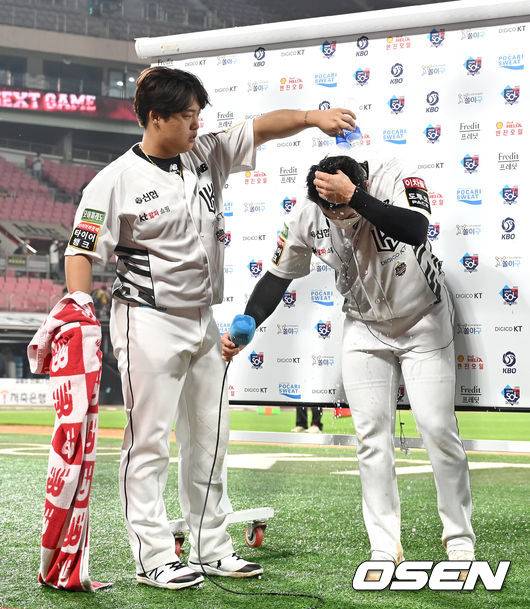 경기를 마치고 방송 인터뷰를 갖는 KT 장준원을 향해 팀 동료 강백호가 음료수 세례를 퍼붓고 있다.