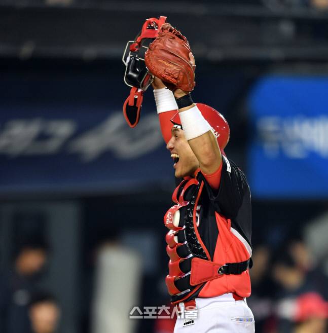 KIA 포수 박동원이 24일 잠실구장에서 열린 2022프로야구 두산베어스와 KIA타이거즈의 경기에서 4-3으로 승리한후 환호하고 있다. 2022.6.23.