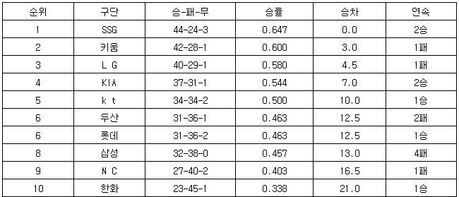 2022 KBO리그 중간순위(24일)