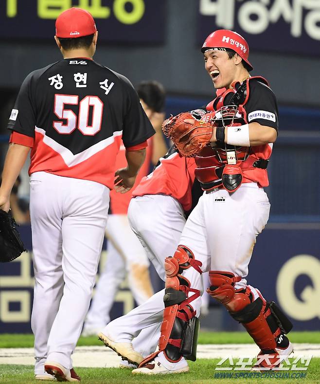 2022 KBO리그 두산베어스와 KIA타이거즈의 경기가 24일 서울잠실야구장에서 열렸다. KIA 마무리 장현식이 팀의 4대3 승리를 확정짓고 박동원과 환호하고 있다. 잠실=최문영 기자 deer@sportschosun.com/2022.06.24/