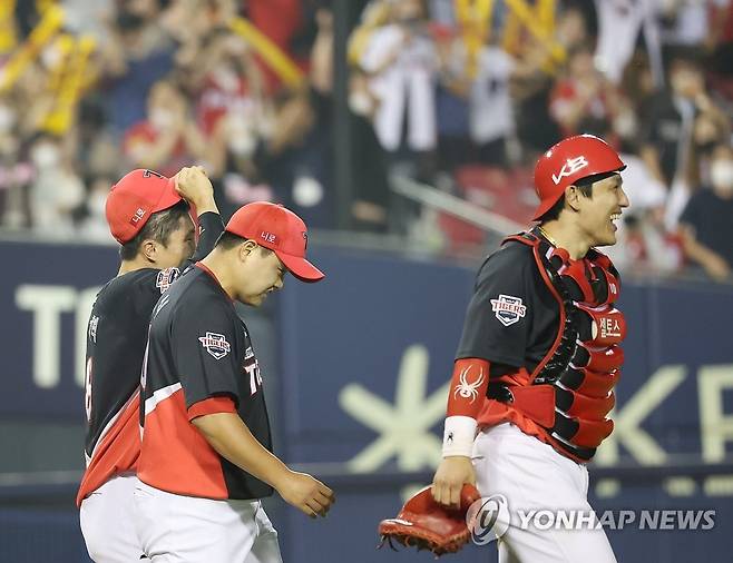 9회말 2사 1,2루 상황에서 두산 강승호의 내야 뜬공을 잡아낸 류지혁(왼쪽)과 박동원(오른쪽), 마무리 장현식(가운데)이 기쁨을 나누고 있다. 2022.6.24