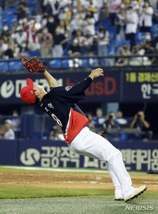 뒤로 넘어지며 타구 잡아내는 박세혁