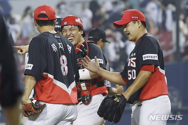 [서울=뉴시스] 최동준 기자 = 24일 서울 잠실야구장에서 열린 2022 KBO 리그 두산 베어스 대 KIA 타이거즈의 경기, 4:3으로 승리한 KIA 박동원, 박세혁, 장현식 등이 기뻐하고 있다. 2022.06.24. photocdj@newsis.com