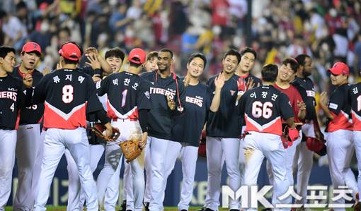 KIA 선수들이 승리 후 기뻐하고 있다.