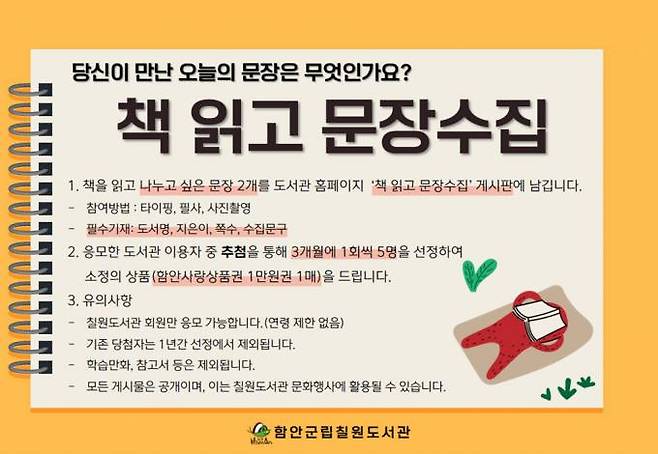 함안군립 칠원도서관은 지난 1월부터 도서관 홈페이지에서 ‘책 읽고 문장수집’ 프로그램을 운영하고 있다. 책 속 문장 2개 이상을 기재한 도서관 회원 중 분기별로 5명을 추첨해 선물로 함안사랑상품권 1만원권을 증정한다.