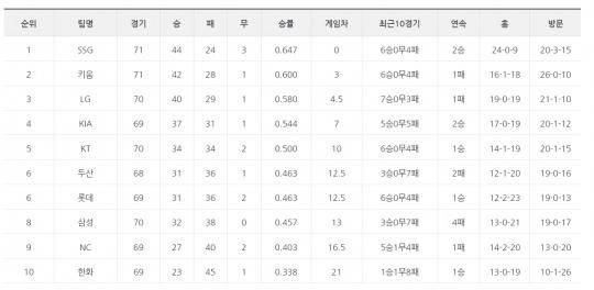 [24일 팀 순위]롯데, 키움 상승세 잠재우고 공동 6위로 2계단 올라..삼성, 한화에 영패로 54일만에 8위 추락