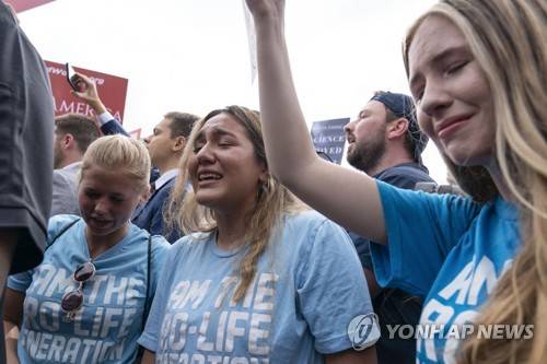Anti-abortion protesters react after the Supreme Court overturned Roe v, Wade, as they gather outside the Supreme Court in Washington, Friday, June 24, 2022. The Supreme Court has ended constitutional protections for abortion that had been in place nearly 50 years, a decision by its conservative majority to overturn the court's landmark abortion cases. (AP Photo/Jose Luis Magana)