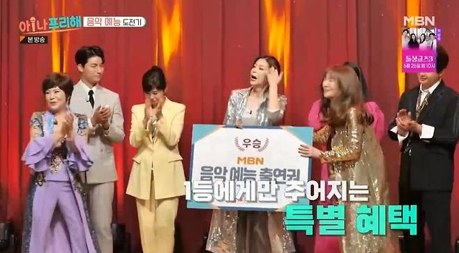 긴장한 것과 달리 MBN 음악 예능 출연권을 획득한 주인공은 황수경이었다. 황수경은 "(김연자) 선생님이 오실 거라는 상상을 못 해서 리허설 때는 자신감 있게 했다. 그런데 선생님이 들어오시는 순간 우리 망했다고 생각했다. 뒤로 넘어가기 직전이었다. 큰 기쁨을 안겨주셔서 진심으로 감사드린다"고 우승 소감을 전했다. (사진=MBN '아!나 프리해' 캡처)