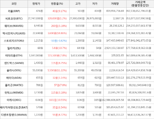 한편 거래금액 기준으로는 리플, 비트코인, 웨이브 순으로 가장 활발한 거래를 보이고 있다.