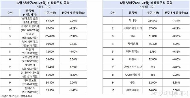 25일 비상장주식 거래 플랫폼 서울거래 비상장에 따르면 6월 넷째주(6월20~24일) 기업가치 상위 10개 종목 중 5개 종목이 하락했다.