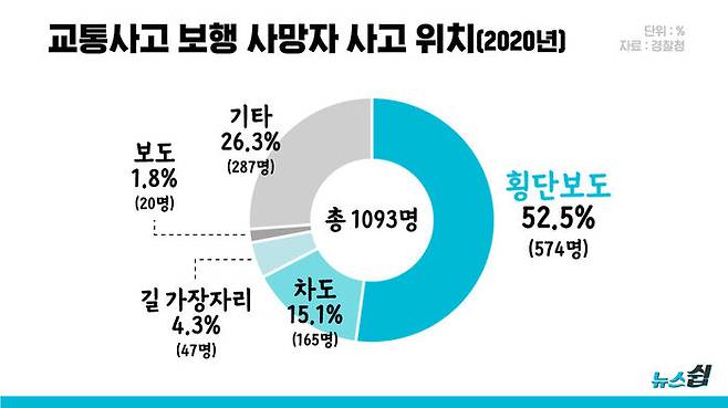 지난 2018년부터 3년 간 우회전 차량에 치여 목숨을 잃은 보행자는 212명이다. 최근 5년 간 국내 교통사고 사망자 3명 중 1명은 보행자다. 지난 5월 경찰청과 도로교통공단이 분석한 결과, 2017~2021년 국내 교통사고 사망자 1만 7,312명 중 보행 사망자는 6,575명이었다. 비율로 따지면, 38%인데 경제협력개발기구(OECD) 회원국 평균인 19.3%(2019년도 기준)보다 2배 정도 높다.
