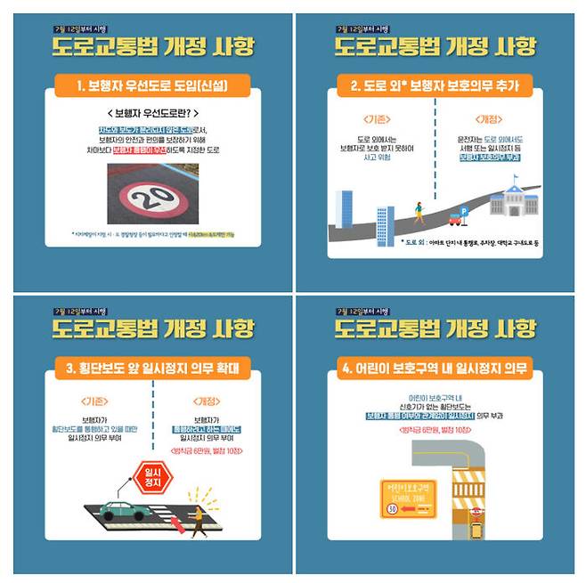 7월부터는 도로 외의 곳을 지나는 운전자에게도 '보행자 보호 의무'가 생긴다. 아파트 단지 등 '도로에 해당하지 않는 장소'를 지나는 운전자도 보행자를 보호해야 한다. 서행 또는 일시 정지 등 보행자 보호 의무를 다하지 않을 경우 역시 20만원 이하의 벌금과 과태료가 부과될 수 있다. 어린이 보호 구역 내 보행자 보호도 강화한다.