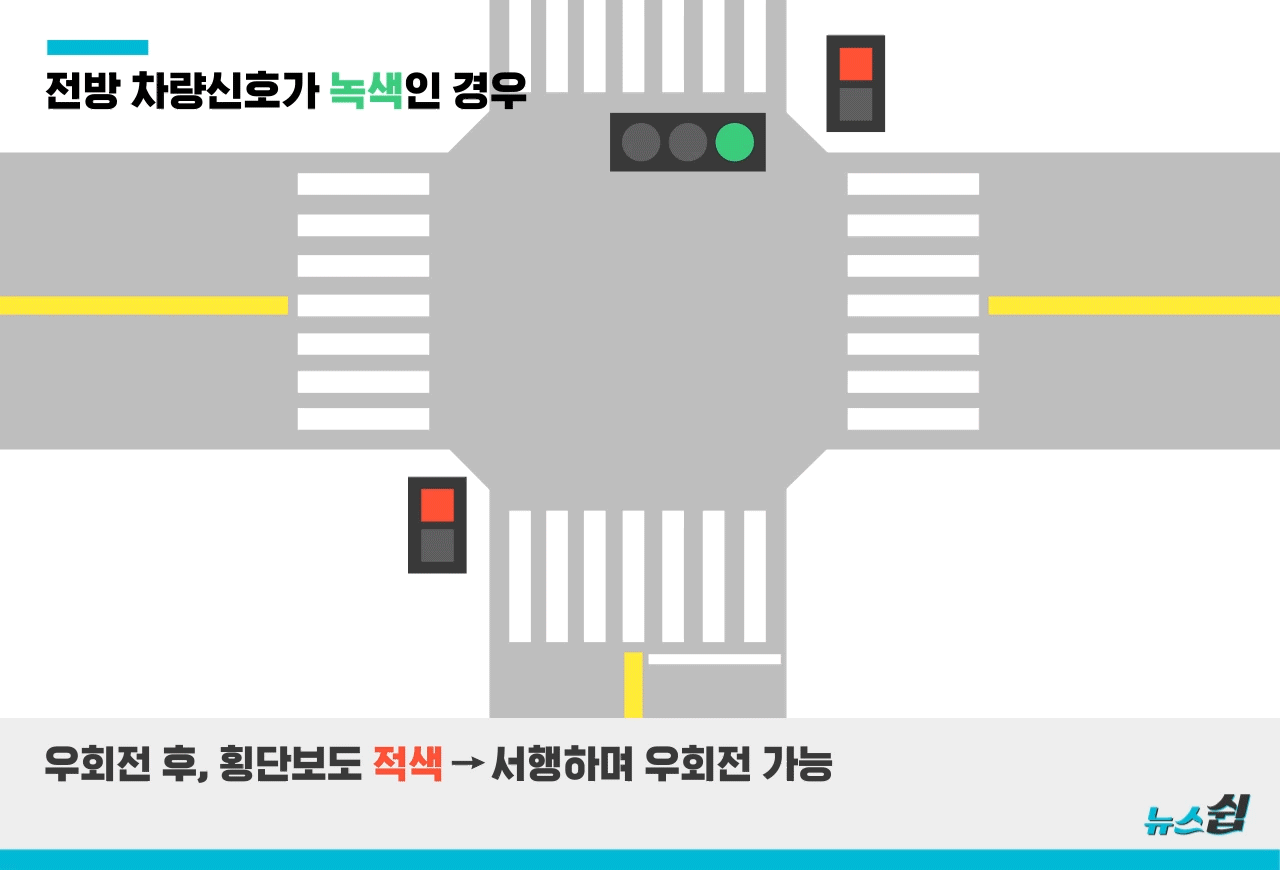 차량 신호가 파란색인데, 우회전해서 만난 횡단보도의 보행자 신호가 파란색이고 보행자가 없는 경우다. 역시 천천히 우회전 해도 된다.