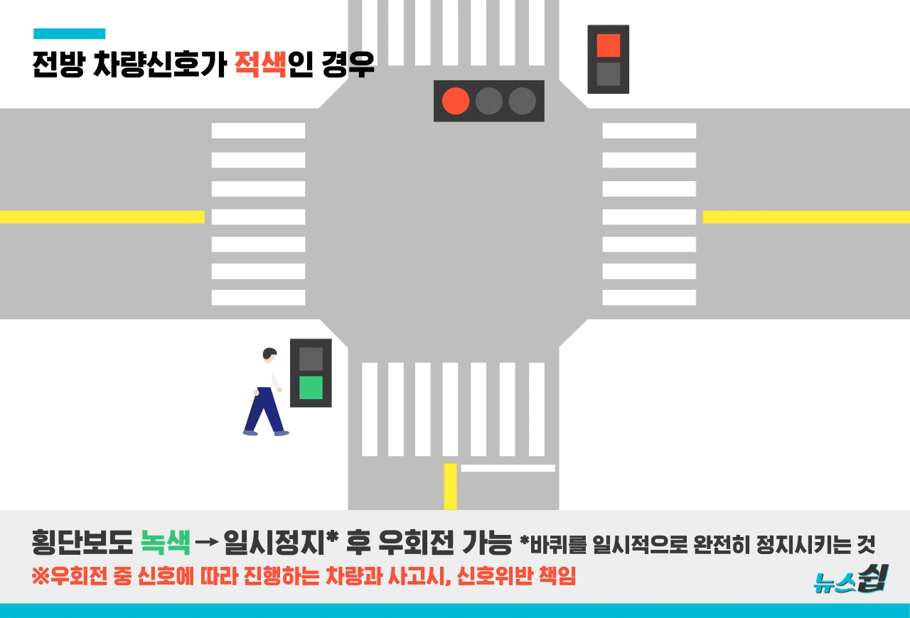 다시 영상으로 돌아가 보자. 7월 12일부터 적용되는 도로교통법에 따른 정답(?)을 확인해 보겠다. 차량 신호가 빨간색이고, 보행자 신호가 초록색이다. 그렇다면 일단 멈췄다가 보행자가 횡단보도를 건너는지, 건너려는 보행자가 있는 지까지 확인하고 우회전을 해야 한다.