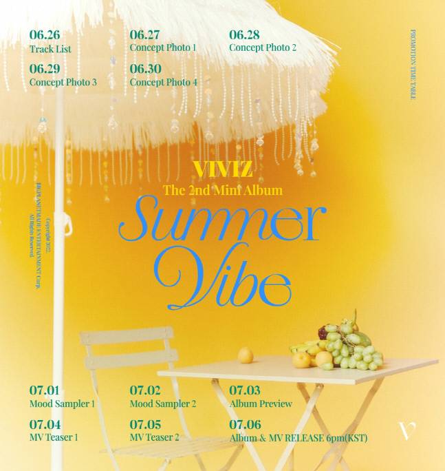 VIVIZ(은하, 신비, 엄지)는 25일 0시 공식 SNS를 통해 두 번째 미니앨범 ‘Summer Vibe(서머 바이브)’의 스케줄 이미지를 공개했다.