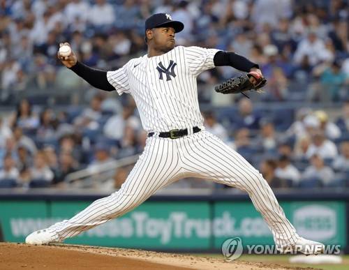 epa10032865 New York Yankees starting pitcher Luis Severino releases a pitch to the Houston Astros in the fourth inning of the Major League Baseball (MLB) game between the Houston Astros and New York Yankees at Yankee Stadium in the Bronx, New York, USA, 24 June 2022. EPA/JASON SZENES