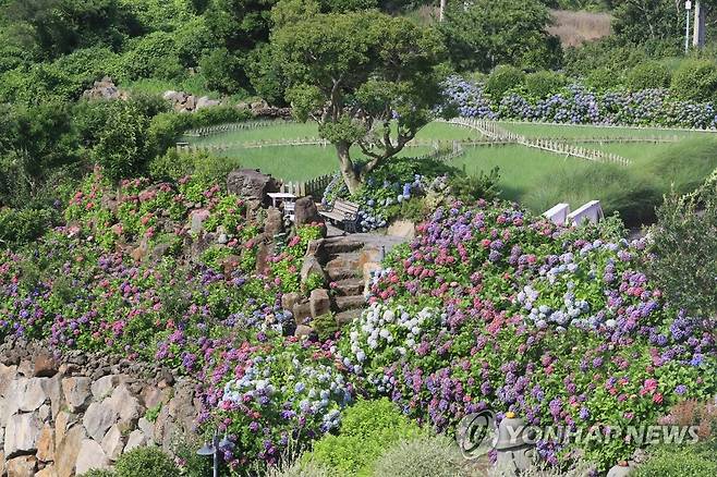 (서귀포=연합뉴스) 박지호 기자 = 장맛비가 잠시 그친 25일 오전 제주 서귀포시 안덕면 카페 마노르블랑을 찾은 관광객이 활짝 핀 수국을 보며 초여름 정취를 만끽하고 있다. 2022.6.25
