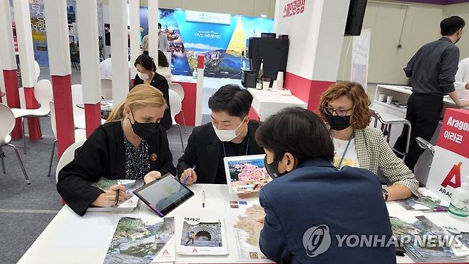 (서울=연합뉴스) 성연재 기자 = 23일부터 26일까지 서울 강남구 삼성동 코엑스에서 열리고 있는 제37회 서울국제관광전의 스페인 부스에서 아라곤 지역 관계자들이 지역 관광 매력을 홍보하고 있다. 2022.06.25