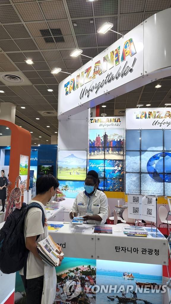 (서울=연합뉴스) 성연재 기자 = 23일부터 26일까지 서울 강남구 삼성동 코엑스에서 열리고 있는 제37회 서울국제관광전의 탄자니아 부스에서 탄자니아관광청 관계자가 손님을 맞고 있다. 2022.06.25