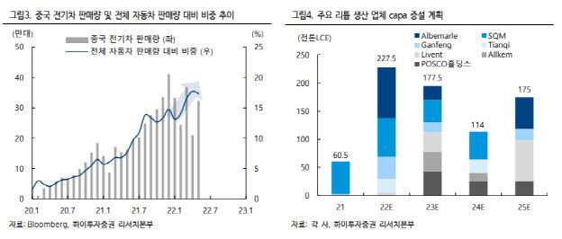 이어 “중국의 경우 지난달 전기차 판매량이 봉쇄 여파가 채 해소되지 않은 상태에서 의미있는 반등을 보여 리튬 수요가 견조함을 보여줬다”며 “중국 내 전체 자동차 판매량 대비 전기차가 차지하는 비중 역시 높아지고 있다”고 부연했다.