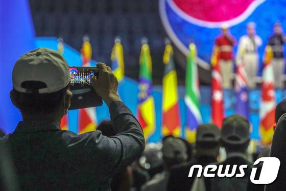 (서울=뉴스1) 민경석 기자 = 25일 오전 서울 중구 장충체육관에서 열린 '6·25 전쟁 제72주년 기념행사'에서 한 참전용사가 행사 모습을 휴대전화 카메라에 담고 있다. 2022.6.25/뉴스1