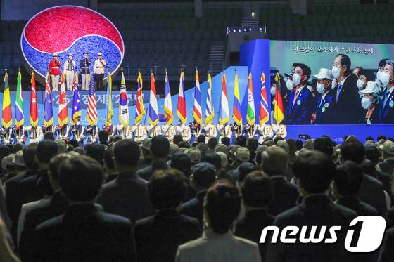 (서울=뉴스1) 민경석 기자 = 한덕수 국무총리 등 내빈들이 25일 오전 서울 중구 장충체육관에서 열린 '6·25 전쟁 제72주년 기념행사'에 참석해 애국가를 제창하고 있다. 2022.6.25/뉴스1