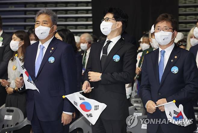 (서울=연합뉴스) 김승두 기자 = 박진 외교부 장관(왼쪽부터)과 한동훈 법무부 장관, 박보균 문화체육관광부 장관이 25일 서울 장충체육관에서 국내·외 참전용사, 정부 주요 인사, 군 주요직위자, 시민, 학생 등 약 1천500명이 참석해 '지켜낸 자유, 지켜갈 평화'를 주제로 열린 6·25전쟁 제72주년 기념행사에 참석해 태극기를 흔들며 6·25 노래를 제창하고 있다. 2022.6.25