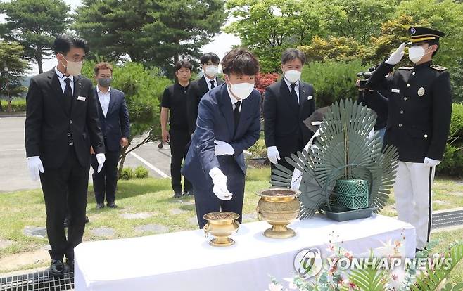 (대전=연합뉴스) 김소연 기자 = 국민의힘 이준석 대표가 한국전쟁 72주년인 25일 대전시 유성구 국립대전현충원 고(故) 백선엽 장군 묘역에서 참배하고 있다. 2022.6.25