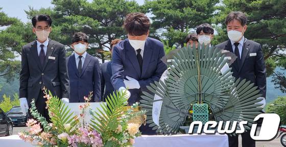(서울=뉴스1) 김경훈 기자 = 이준석 국민의힘 대표가 25일 국립대전현충원에서 고(故) 백선엽 장군 묘역을 참배하고 있다. 2022.6.25/뉴스1