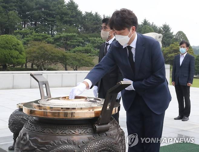 (대전=연합뉴스) 김소연 기자 = 국민의힘 이준석 대표가 한국전쟁 72주년인 25일 대전시 유성구 국립대전현충원을 방문해 참배하고 있다. 2022.6.25