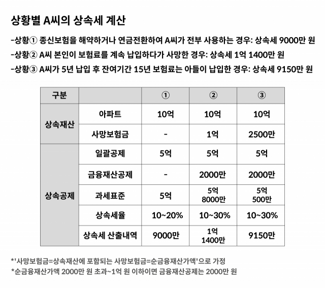 ① A씨가 생전에 종신보험을 해약하거나 연금전환 등을 통해 생활비로 소비한다면 아들이 상속받는 사망보험금이 전혀 없기 때문에 아파트 1채에 대한 상속세 9000만원이 발생한다.