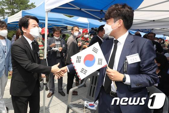 (칠곡=뉴스1) 공정식 기자 = 국민의힘 이준석 대표(오른쪽)와 안철수 의원이 25일 오후 경북 칠곡군 다부동전적기념관에서 열린 6.25전쟁 제72주년 '백선엽 장군 서거 2주기 추모 행사'에 참석해 인사를 나누고 있다. 2022.6.25/뉴스1