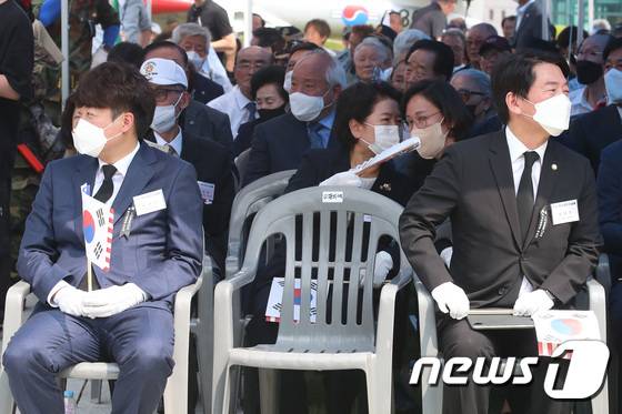 (칠곡=뉴스1) 공정식 기자 = 국민의힘 이준석 대표(왼쪽)와 안철수 의원이 25일 오후 경북 칠곡군 다부동전적기념관에서 열린 6.25전쟁 제72주년 ‘백선엽 장군 서거 2주기 추모 행사’에 참석해 다른 곳을 응시하고 있다. 2022.6.25/뉴스1