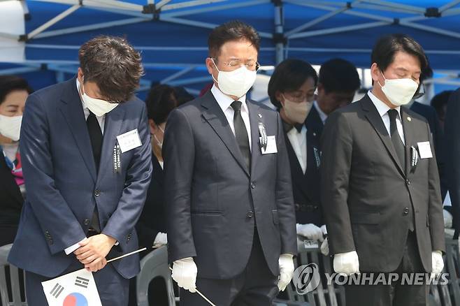 (칠곡=연합뉴스) 박세진 기자 = 국민의힘 이준석 대표와 안철수 의원, 이철우 경북도지사(가운데)가 25일 경북 칠곡군 다부동 전적기념관에서 열린 6·25전쟁 72주년 기념 및 백선엽 장군 2주기 추모행사에 참석하고 있다. 2022.6.25