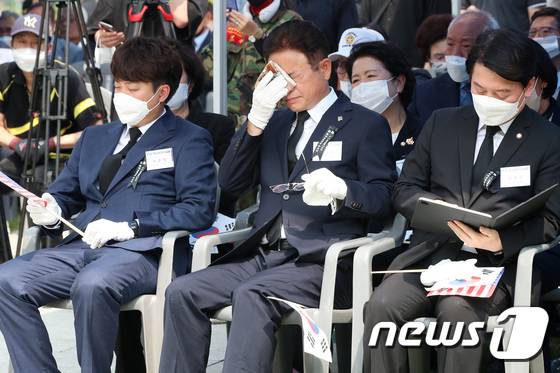(칠곡=뉴스1) 공정식 기자 = 이준석 국민의힘 대표, 이철우 경북도지사, 안철수 의원(왼쪽부터)이 25일 오후 경북 칠곡군 다부동전적기념관에서 열린 6.25전쟁 제72주년 '백선엽 장군 서거 2주기 추모 행사'에 참석해 나란히 앉아 각자 다른 곳을 보고 있다.