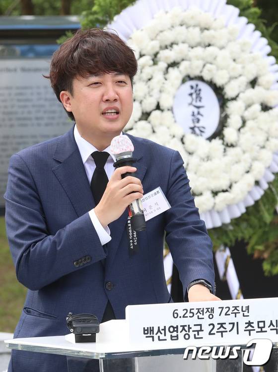 (칠곡=뉴스1) 공정식 기자 = 이준석 국민의힘 대표가 25일 오후 경북 칠곡군 다부동전적기념관에서 열린 6.25전쟁 제72주년 '백선엽 장군 서거 2주기 추모 행사'에 참석해 추모사를 전하고 있다. 2022.6.25/뉴스1
