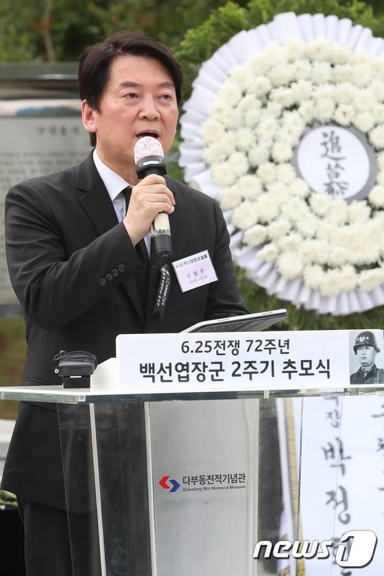 (칠곡=뉴스1) 공정식 기자 = 안철수 국민의힘 의원이 25일 오후 경북 칠곡군 다부동전적기념관에서 열린 6.25전쟁 제72주년 '백선엽 장군 서거 2주기 추모 행사'에 참석해 추모사를 전하고 있다. 2022.6.25/뉴스1