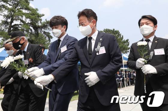 (칠곡=뉴스1) 공정식 기자 = 이준석 국민의힘 대표, 이철우 경북도지사, 안철수 의원(왼쪽부터)이 25일 오후 경북 칠곡군 다부동전적기념관에서 열린 6.25전쟁 제72주년 '백선엽 장군 서거 2주기 추모 행사'에 참석해 헌화하고 있다. 2022.6.25/뉴스1
