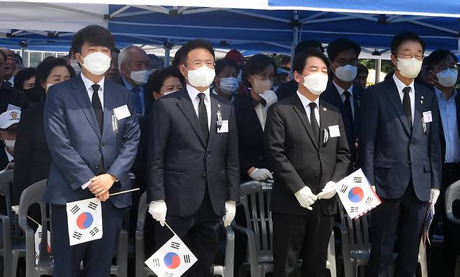 [칠곡=뉴시스] 이무열 기자 = 이준석 국민의힘 대표와 이철우 경북도지사, 안철수 의원이 25일 오후 경북 칠곡군 다부동 전적기념관에서 열린 6·25전쟁 72주년 기념 및 백선엽 장군 2주기 추모행사에 참석하고 있다. (사진=경북도 제공) 2022.06.25. photo@newsis.com *재판매 및 DB 금지