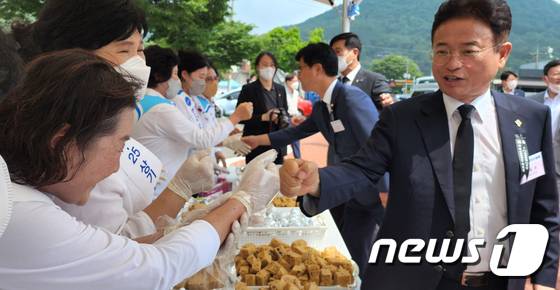 (칠곡=뉴스1) 정우용 기자 = 6·25전쟁 72주년인 25일 경북 칠곡 다부동전적기념관에서 열린 백선엽장군 서거 2주기 추모행사에서 이철우 경북지사가 자원봉사자들과 주먹악수를 하고 있다. 2022.6.25/뉴스1