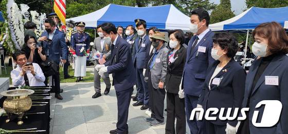 (칠곡=뉴스1) 정우용 기자 = 6·25전쟁 72주년인 25일 경북 칠곡 다부동전적기념관에서 열린 백선엽장군 서거 2주기 추모행사에 참석한 김영식, 정희용, 이인석 의원 등이 헌화를 하고 있다. 2022.6.25/뉴스1