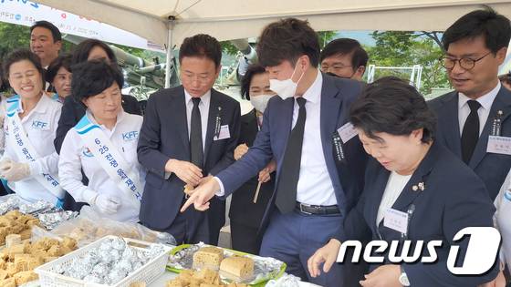 (칠곡=뉴스1) 정우용 기자 = 6·25전쟁 72주년인 25일 경북 칠곡 다부동전적기념관에서 열린 백선엽장군 서거 2주기 추모행사에서 이준석 당대표가 이철우 경북지사와 함께 보리밥으로 만든 주먹밥과 보리떡을 보고 있다.2022.6.25/뉴스1
