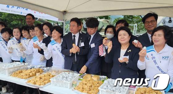 (칠곡=뉴스1) 정우용 기자 = 6·25전쟁 72주년인 25일 경북 칠곡 다부동전적기념관에서 열린 백선엽장군 서거 2주기 추모행사에서 이준석 대표가 이철우 경북지사와 함께 보리떡을 시식하고 있다. 2022.6.25/뉴스1