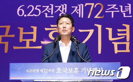 (구미=뉴스1) 정우용 기자 = 6·25전쟁 72주년인 25일 경북 구미 박정희체육관에서 열린 호국보훈기념행사에서 김장호 구미시장 당선인이 인사말을 하고 있다. (구미시 제공) 2022.6.25/뉴스1